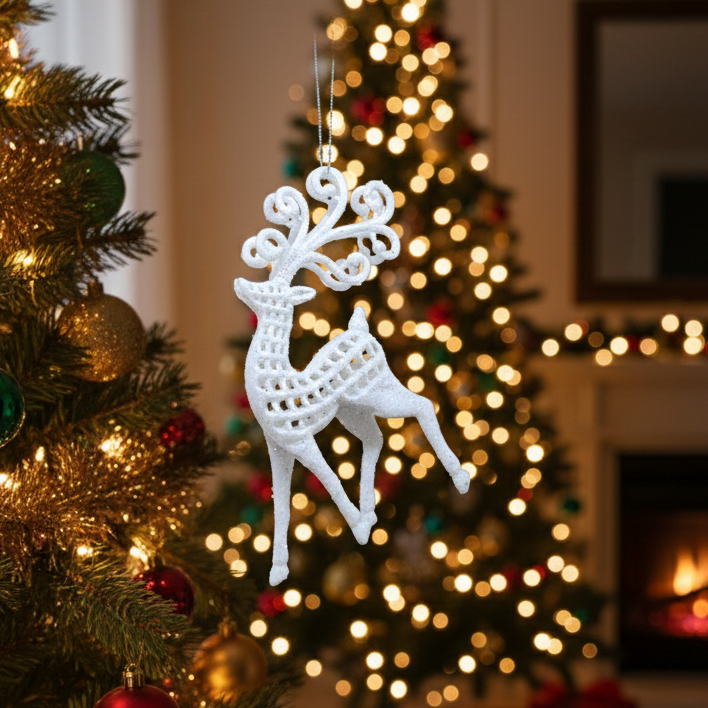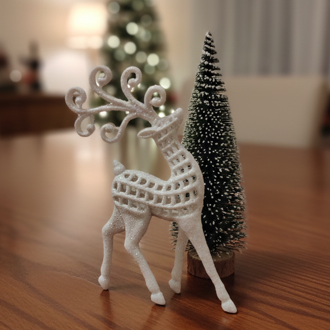 Bring festive charm to your home with this beautifully crafted tabletop décor set featuring a sparkling reindeer and a snowy mini Christmas tree, each standing 15 cm tall. Perfect for adding a touch of elegance to your Christmas decorations, this set enhances any corner—be it your living room, office desk, dining table, or festive display shelf.