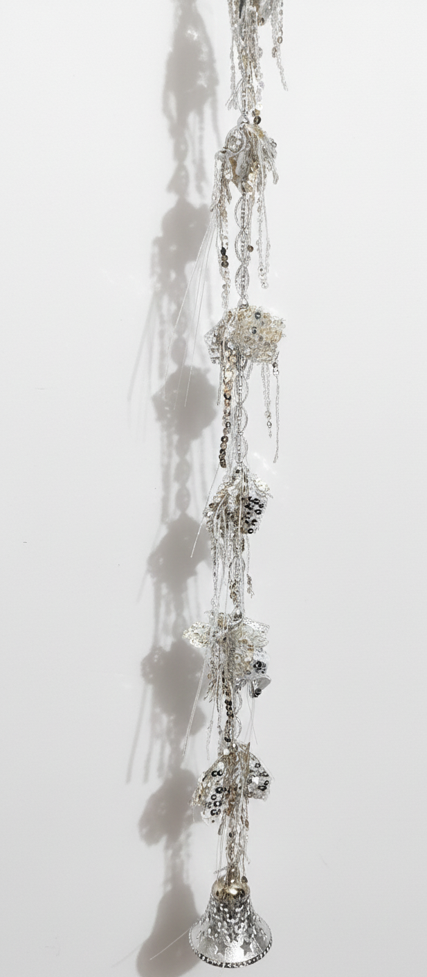 • Luxurious Embellishment: Adorned with a dense mix of silver and gold sequins, beads, and shimmering tinsel-like strands for maximum sparkle.