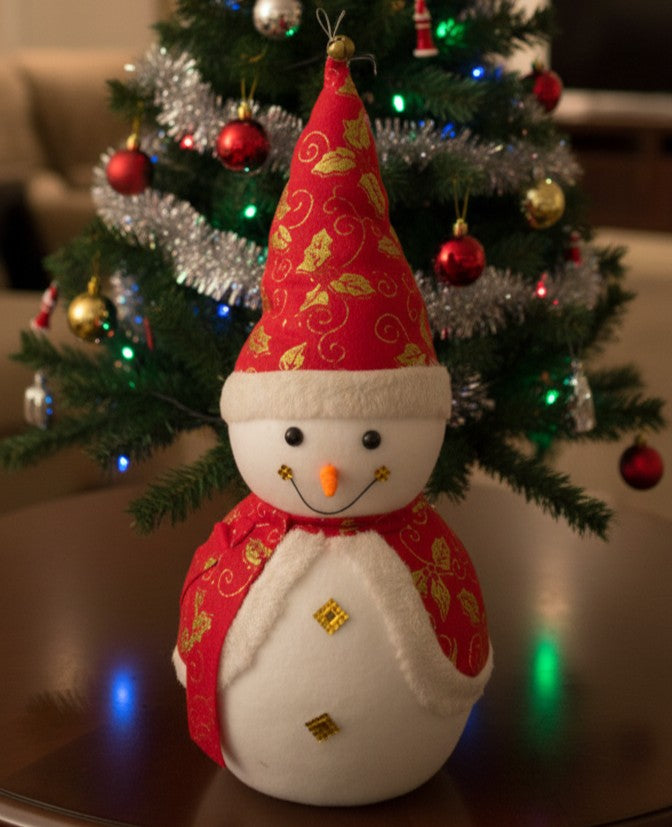 Bring festive magic to your holiday décor with this premium 50 cm snowman, beautifully dressed in a rich red and gold outfit. With its soft finish, detailed craftsmanship, and charming expression, this snowman adds a warm and joyful presence to any Christmas setup.